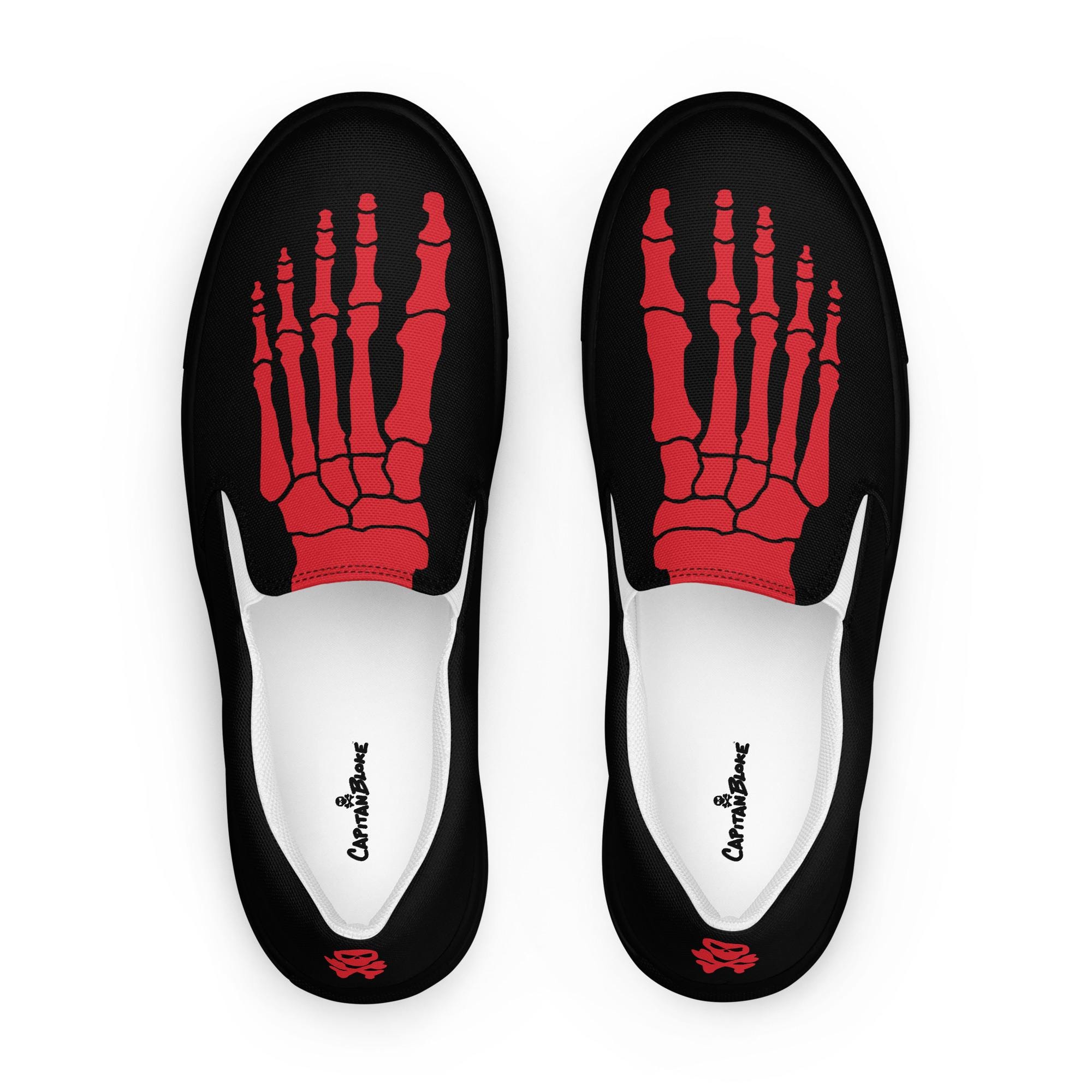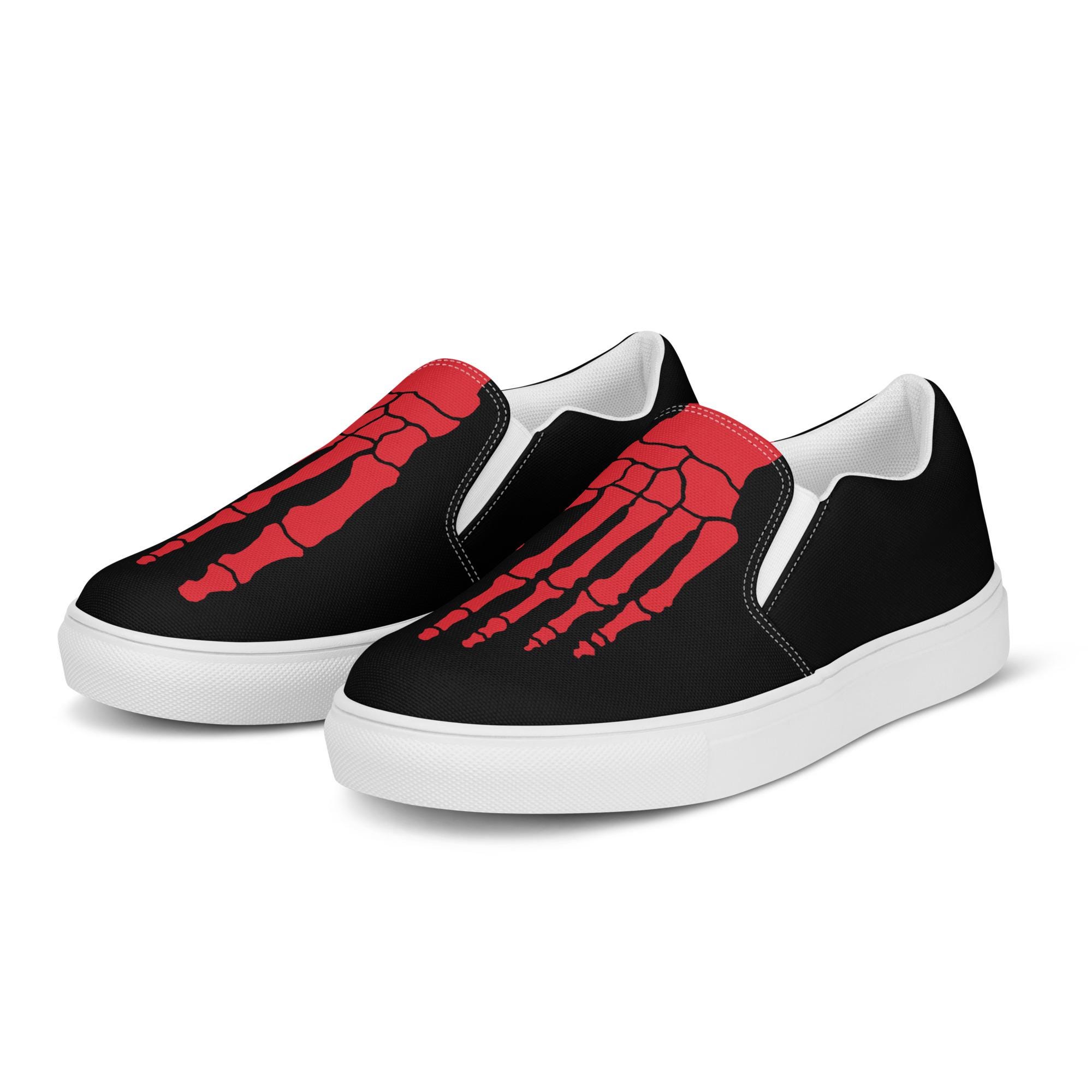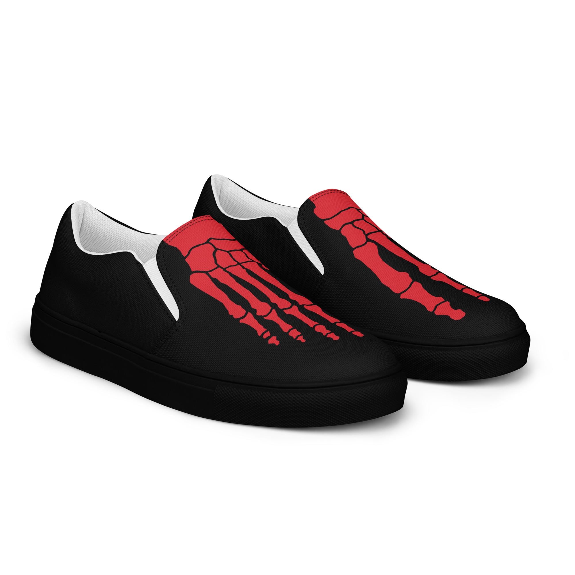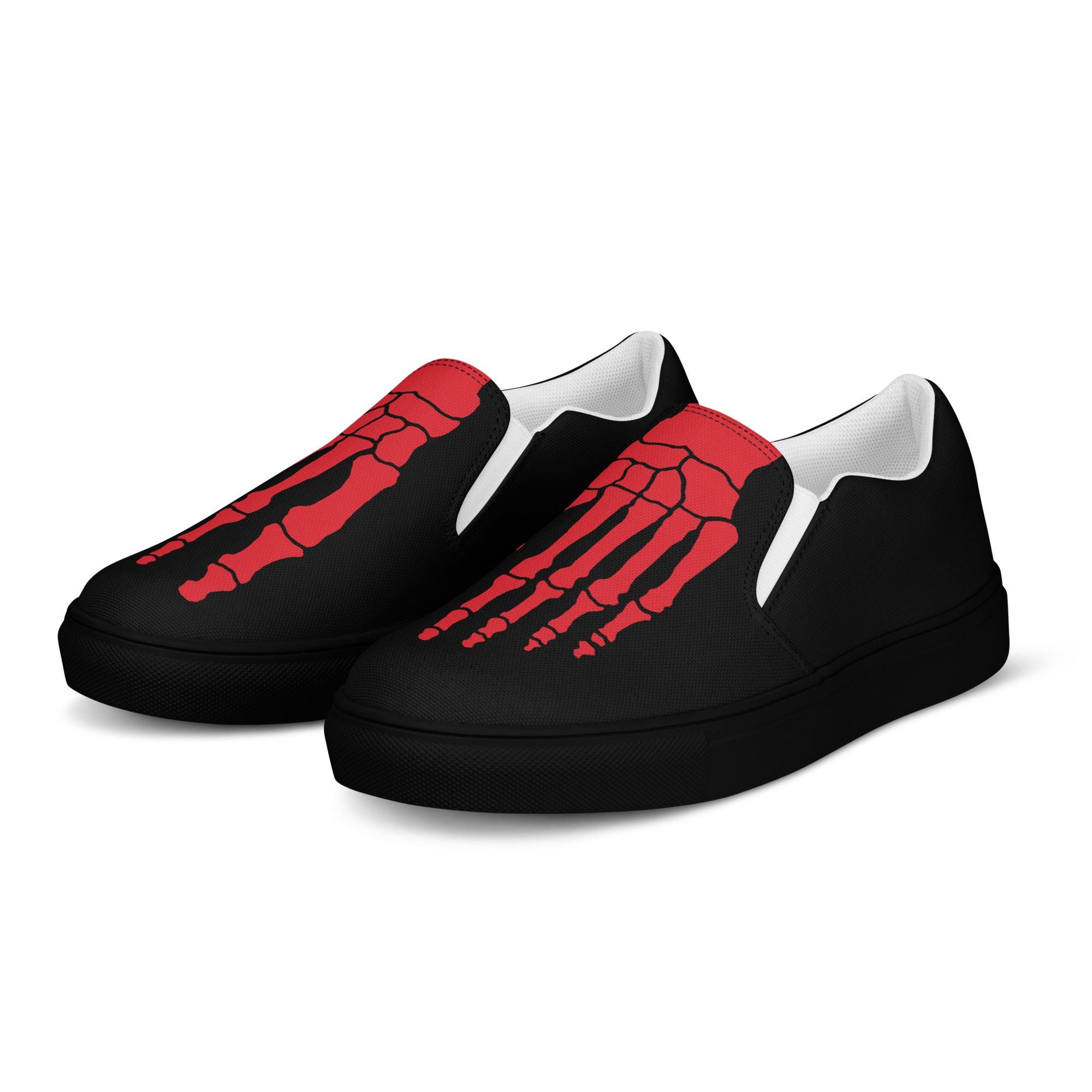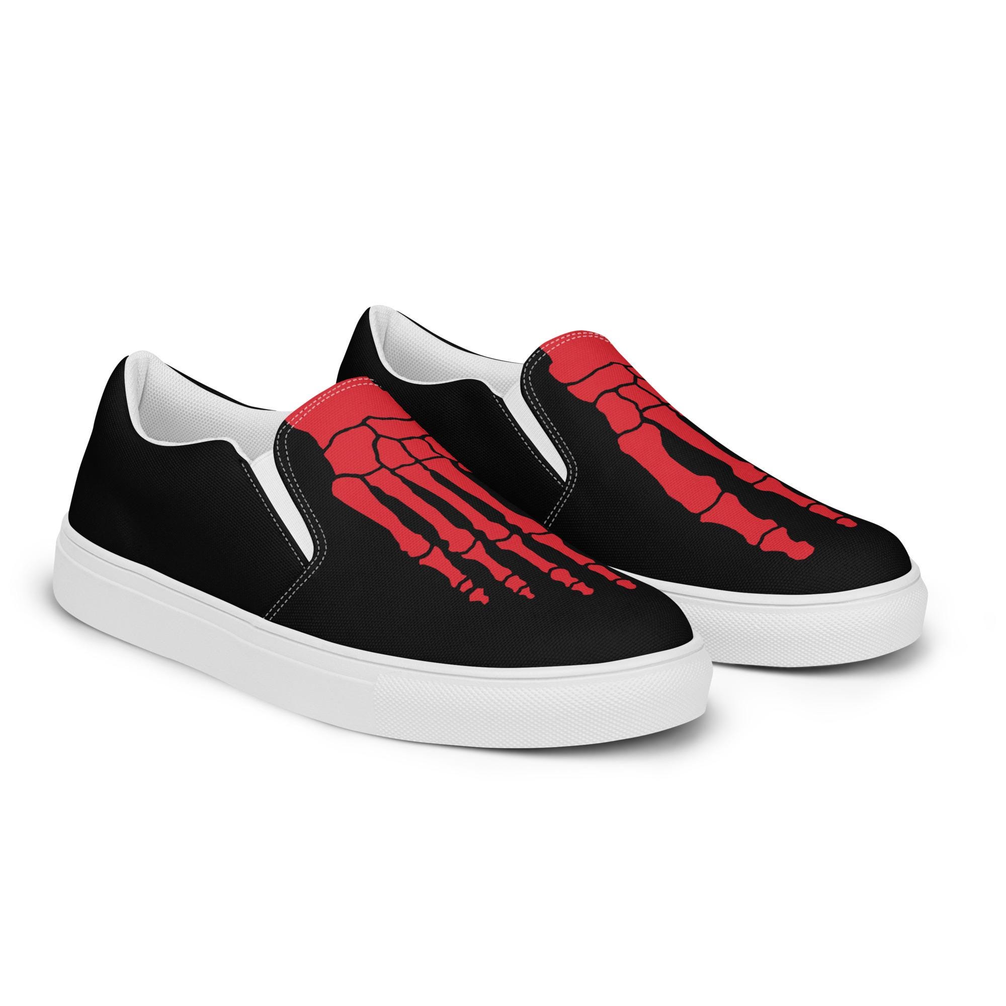 Each pair is printed, cut, and handmade, ensuring a unique touch of craftsmanship. Whether you're looking to add a quirky element to your wardrobe or want a fun, comfortable shoe for casual occasions, these Red Skeleton Feet slip-ons are the perfect choice.
