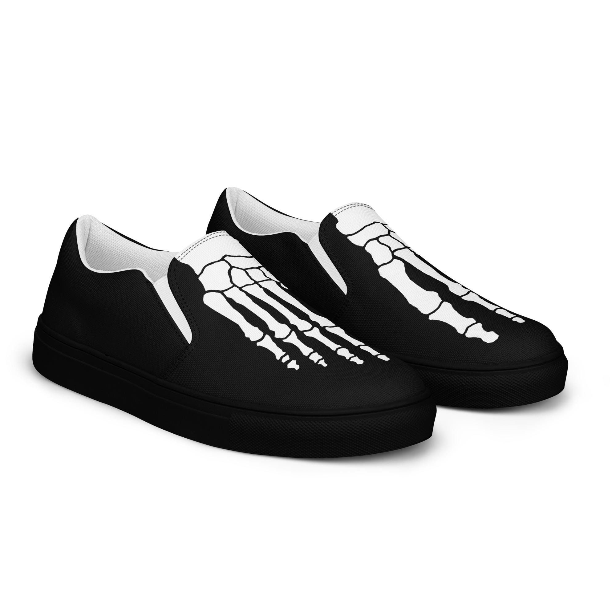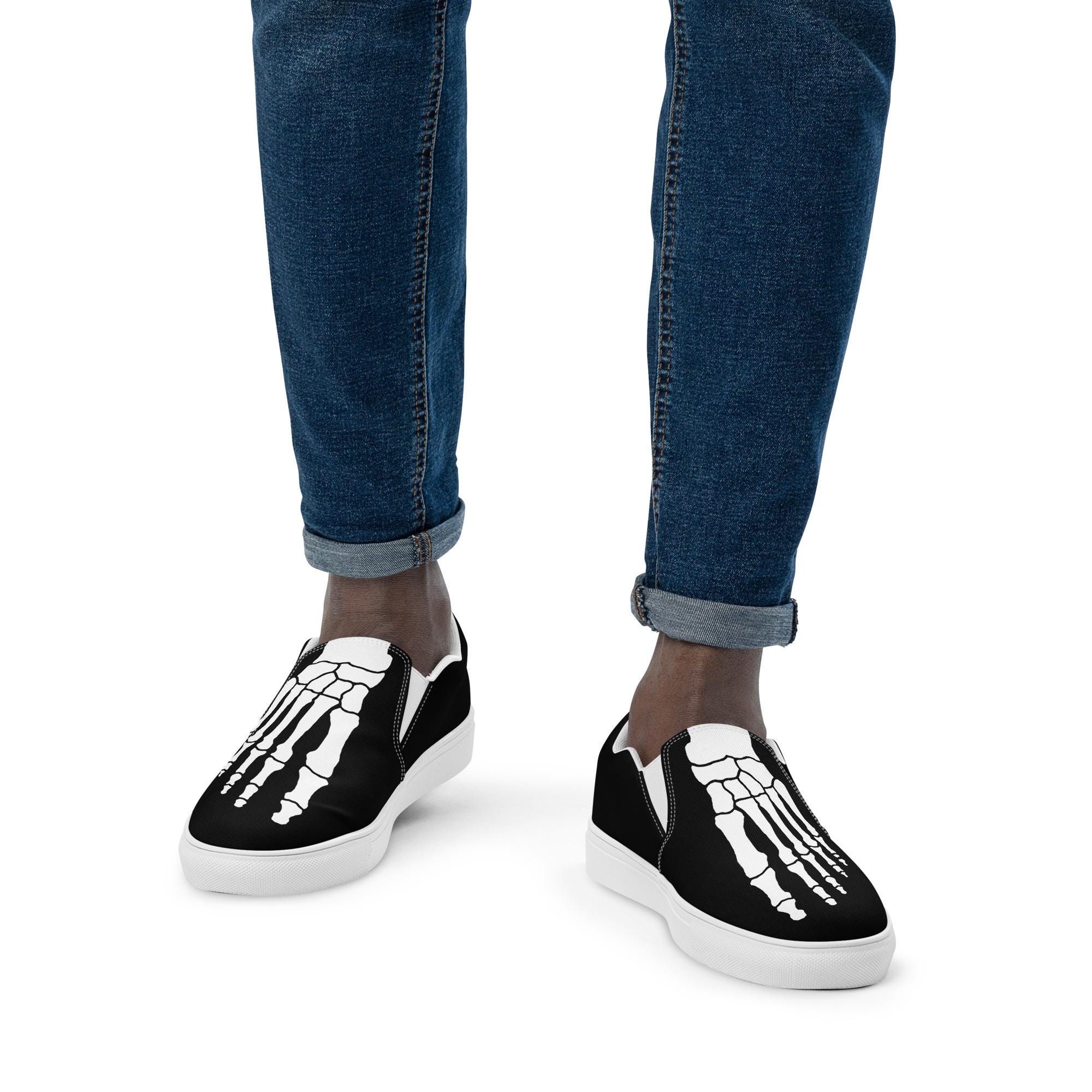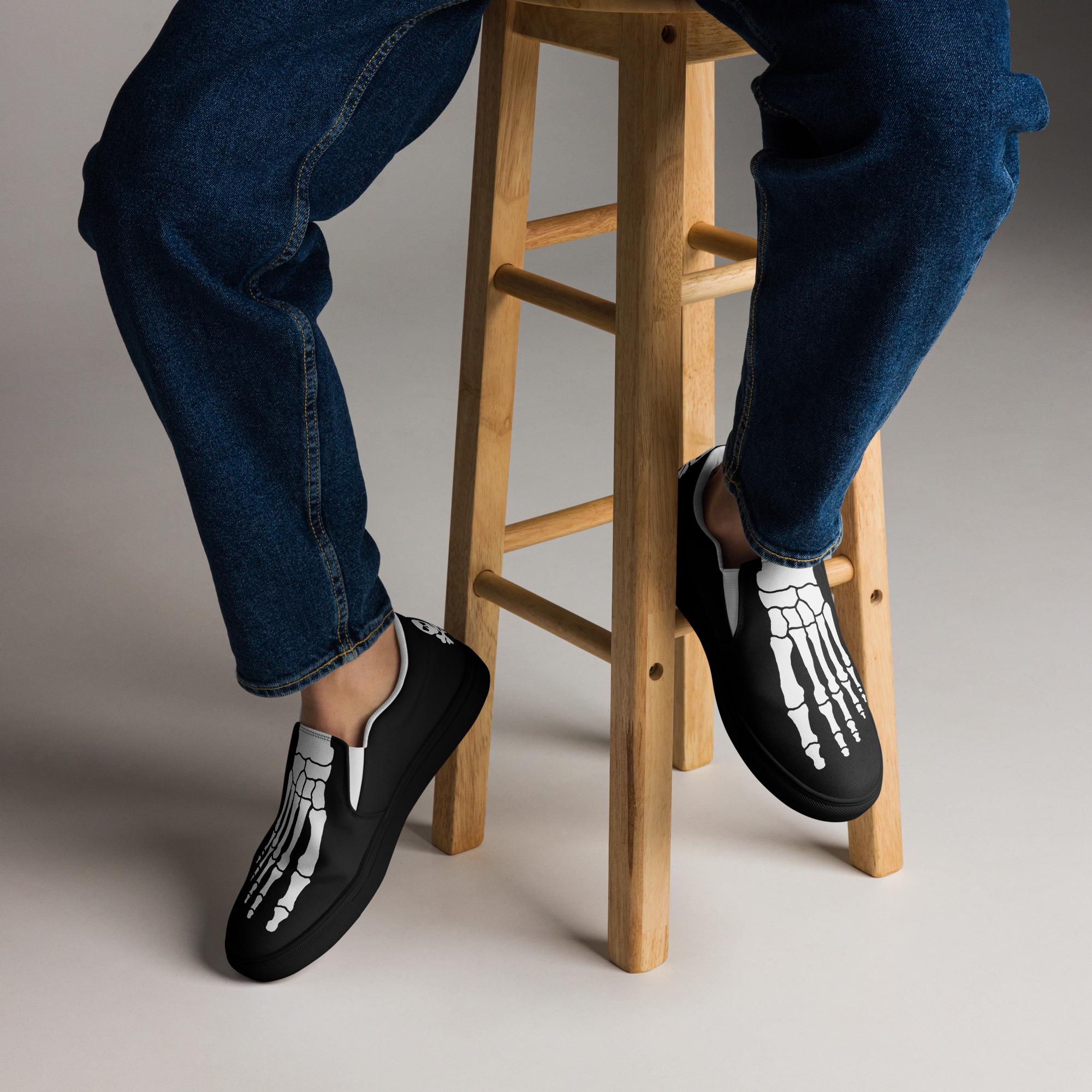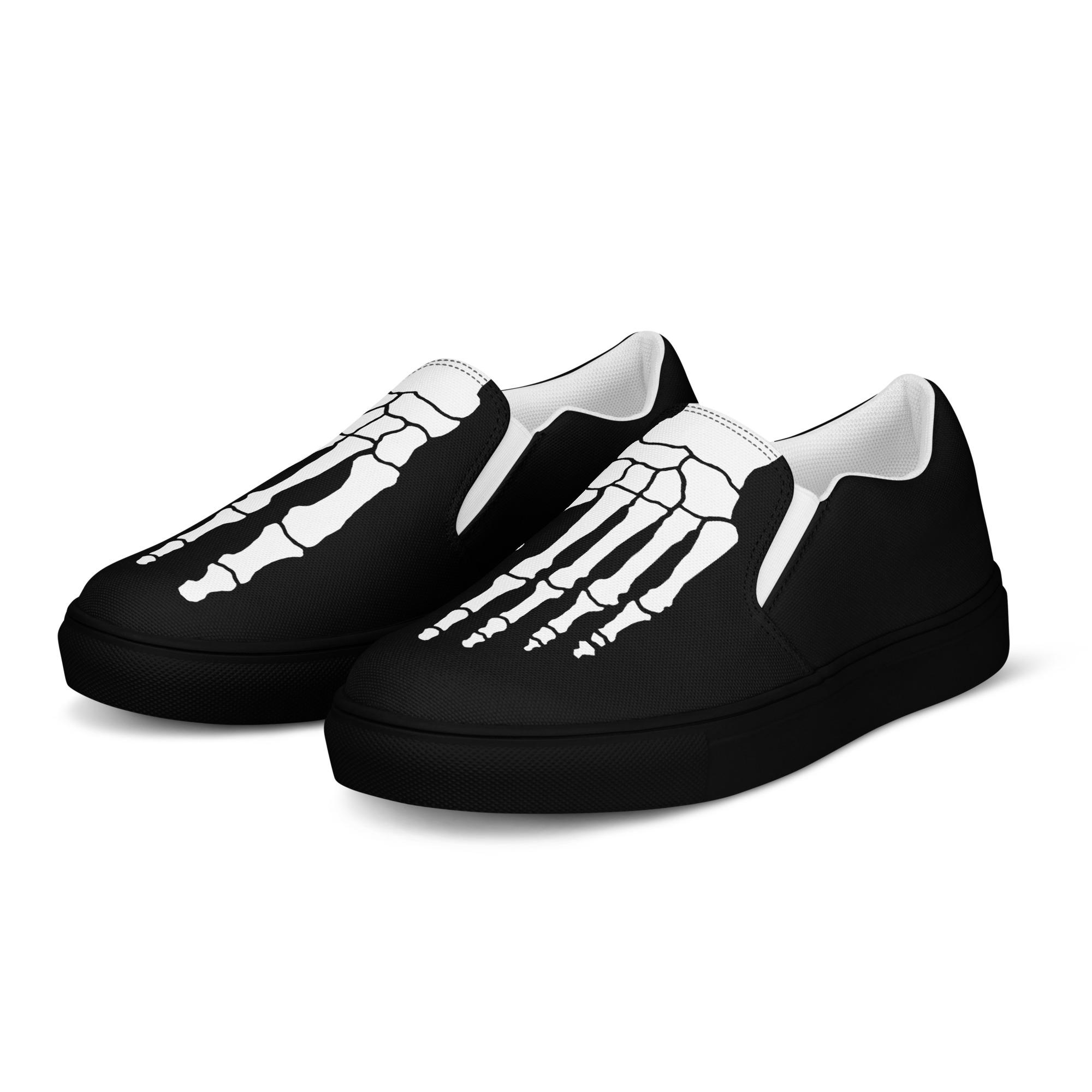 Step into spooky style with the White Skeleton Feet Men's Slip-On Canvas Shoes by CapitanBloke! These eye-catching shoes are perfect for those who love to make a statement while staying comfortable all day long. Featuring a bold skeleton foot print on a crisp white canvas, they add a playful yet edgy touch to any outfit.